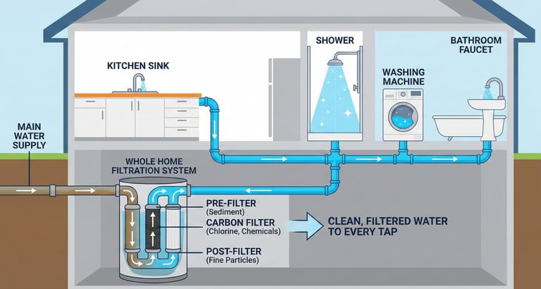 Whole home water filtration improves the quality of water before it reaches any faucet in your home. Instead of treating water at one sink, filtration systems work at the point where water enters the house — helping ensure cleaner water everywhere.